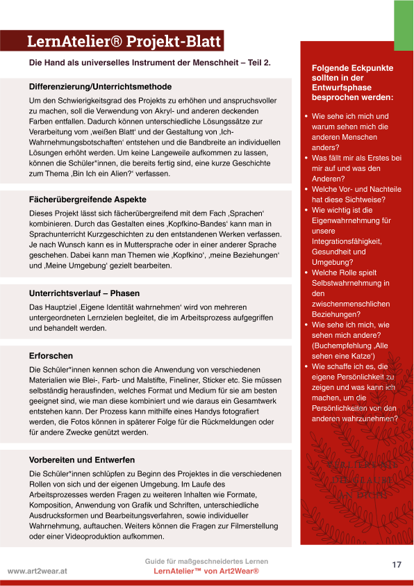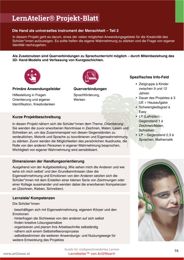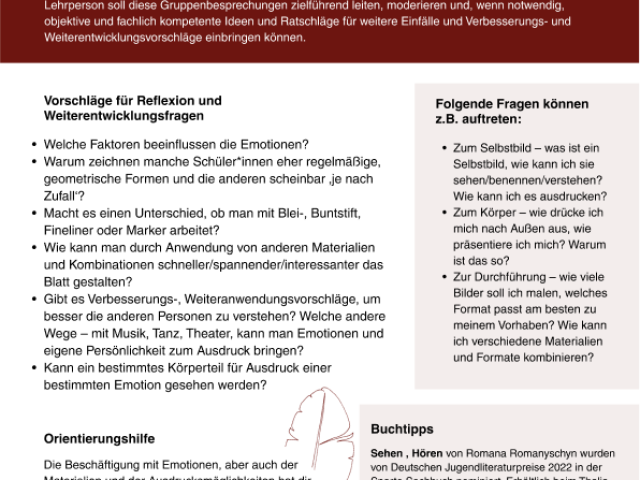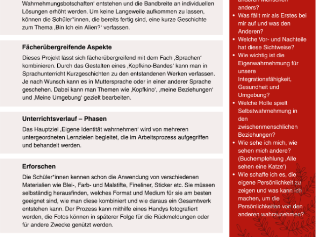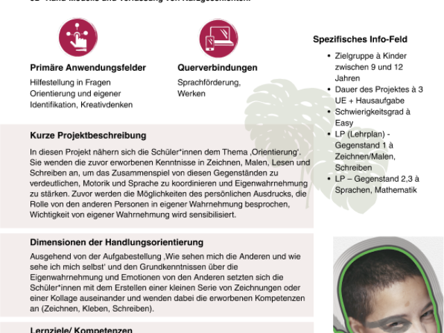 ENG The learning project "Orientation Exploration" aims to provide students with an understanding of orientation and its various applications. It promotes self-awareness, reflection on one's own identity, and examines the work of Alberto Giacometti. By incorporating self-created drawing series and writing short stories, the project enables interdisciplinary connections to language learning and artistic craftsmanship. Additionally, short films can be made available to students to stimulate open discussions.