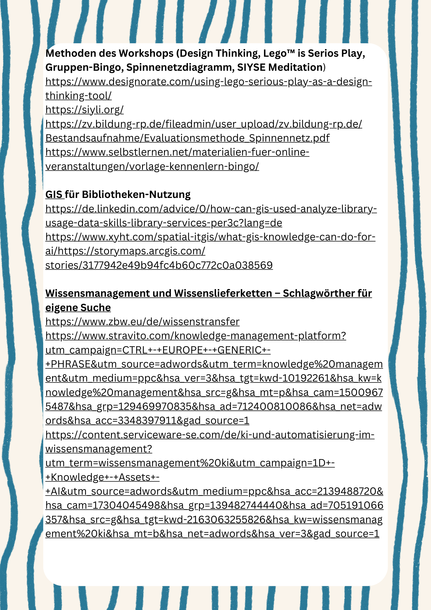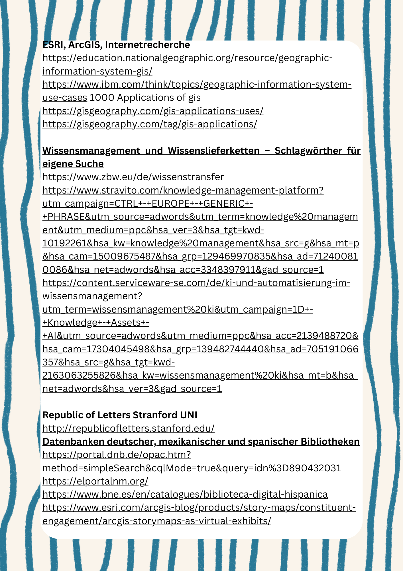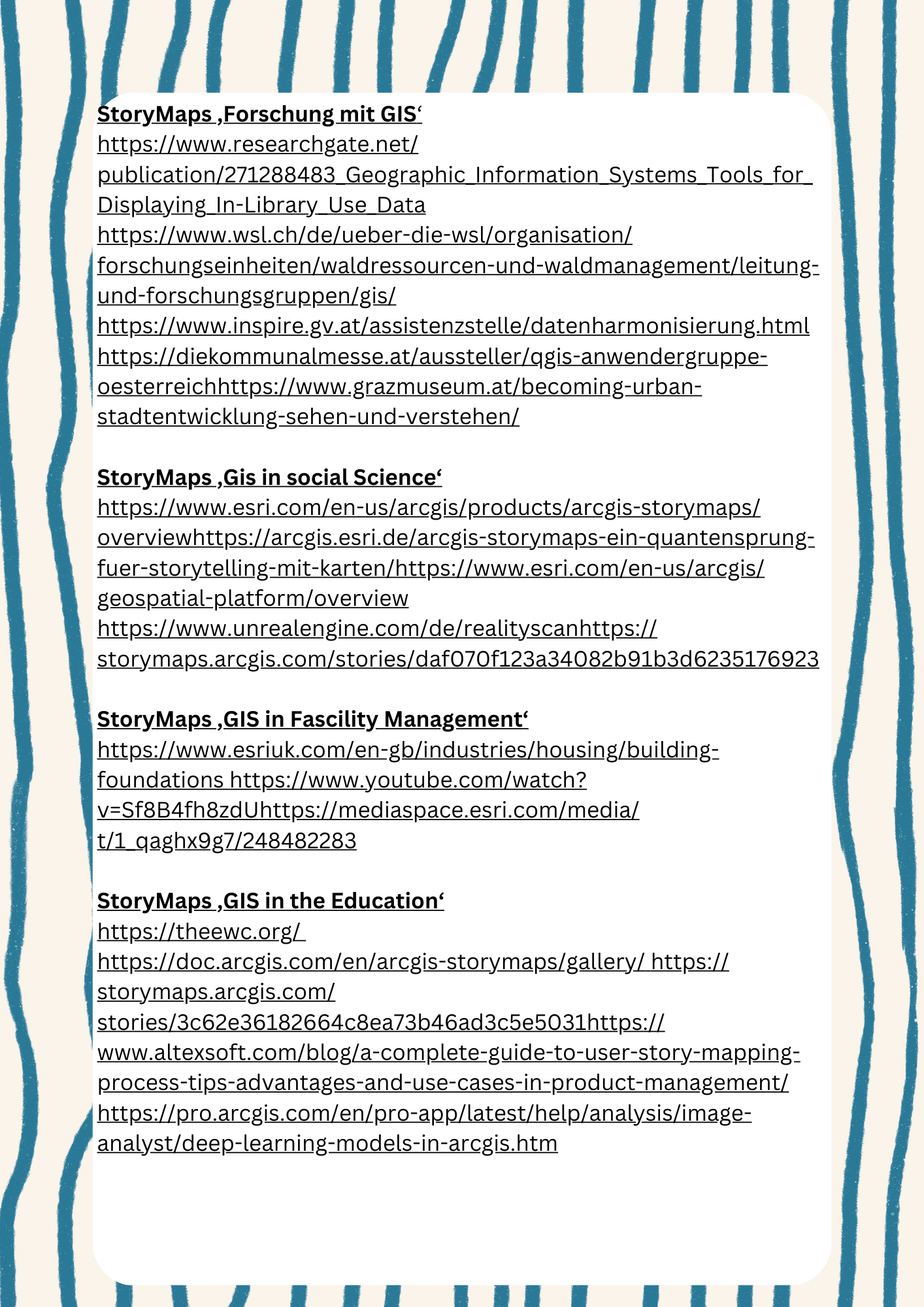 Ich habe mich bewusst entschieden, einen Leitfaden sowie die umfassenden Quellen, die ich bei der Vorbereitung des Workshops verwendet habe, bereitzustellen. Damit möchte ich es den Teilnehmer*innen ermöglichen, sich eigenständig Wissen in den Bereichen anzueignen, die sie persönlich spannend oder relevant finden. So können individuelle Interessen gefördert werden – ohne das klassische „Gießkannen-Prinzip“. Hier ist der Link zur der GIS-Präsentation von ESRI - einem der führenden Anbietrn dieser Technologie. https://www.youtube.com/watch?v=Hau_ZCmN8eU